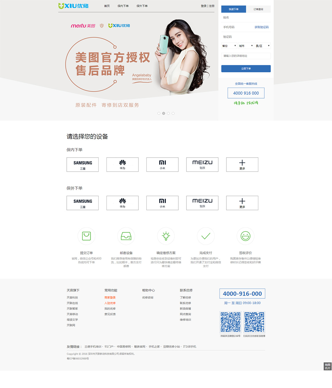 優(yōu)修是天音控股旗下子公司「天聯(lián)新動」重點打造的O2O品牌。提供免費上門、原廠品質配件、維修錄像、90天超長質保!