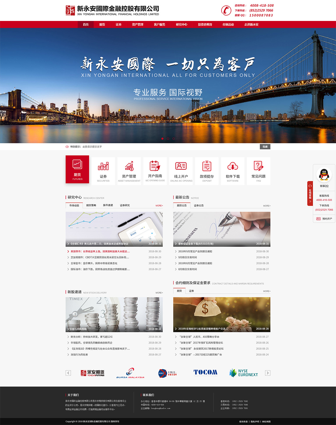 新永安國際金融控股有限公司(“新永安國際”),是永安期貨股份有限公司(國內(nèi)新三板證券代碼833840)在香港設(shè)立的全資子公司。新永安國際作為永安期貨重要的國際化窗口,將以建立中國境內(nèi)外業(yè)務(wù)聯(lián)動的交易通道、資金通道、資管平臺和貿(mào)易平臺為目的,統(tǒng)一管理、協(xié)調(diào)永安期貨在中國海外的業(yè)務(wù),完成永安期貨在中國海外的機構(gòu)戰(zhàn)略設(shè)置和布局,以香港為立足點,布局全球金融業(yè)務(wù)拓展,發(fā)展戰(zhàn)略服從永安期貨的國際化總戰(zhàn)略。