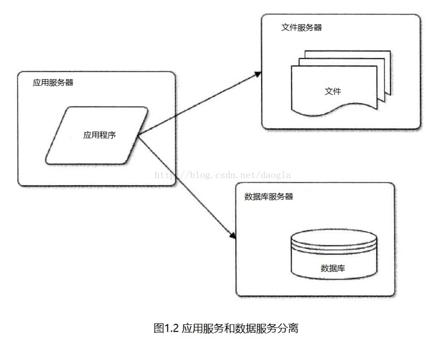 當(dāng)業(yè)務(wù)量持續(xù)增加到一定量以后,執(zhí)行應(yīng)用程序、讀寫文件、訪問數(shù)據(jù)庫應(yīng)該有所區(qū)分,保證各自的需求都能得到滿足,這時(shí)候你需要考慮把應(yīng)用服務(wù)器、文件服務(wù)器、數(shù)據(jù)庫服務(wù)器分離,這個(gè)時(shí)候的服務(wù)器架構(gòu)應(yīng)該是下面這樣的,它是由三個(gè)獨(dú)立的服務(wù)器組成,各司其職。