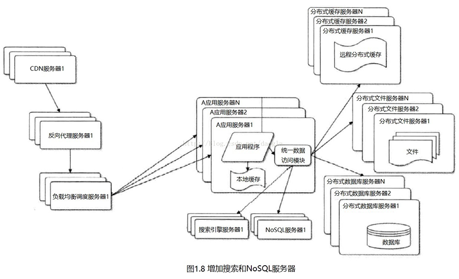 對于有搜索和大量查詢的網(wǎng)絡(luò)業(yè)務(wù),還需要增加獨(dú)立的搜索引擎和NoSQL服務(wù)器。