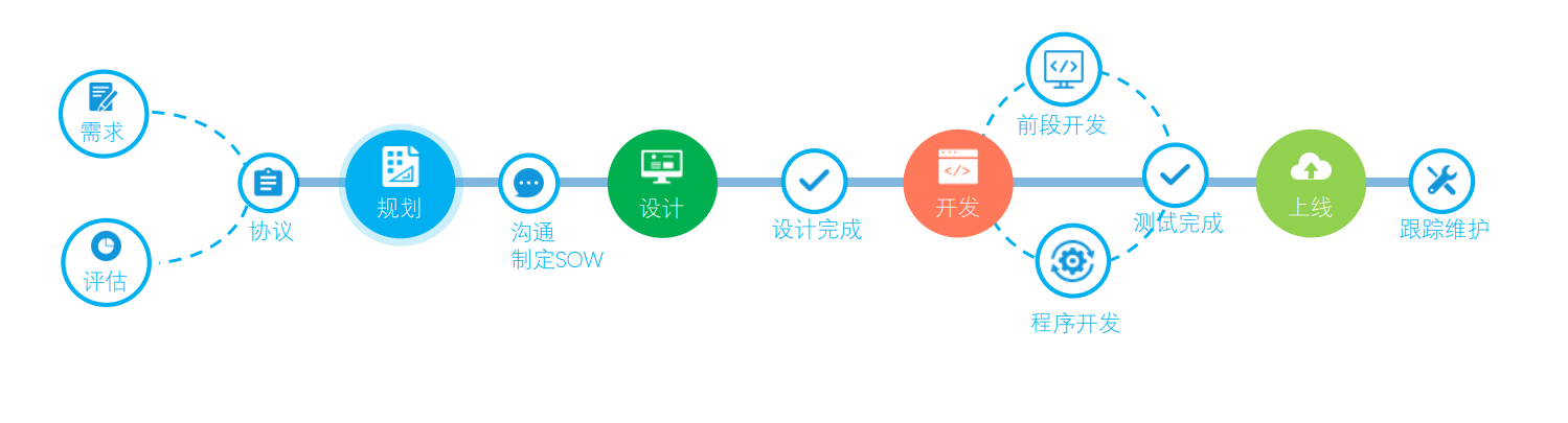 首先是客戶需求調(diào)研,項(xiàng)目經(jīng)理方案規(guī)劃,商務(wù)洽談、提供材料、ui設(shè)計(jì)制作、客戶驗(yàn)收、部署上線、后期免費(fèi)維護(hù)。