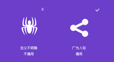 在設(shè)計(jì)圖標(biāo)時(shí),必須使用與所對(duì)應(yīng)功能緊密關(guān)聯(lián)的圖標(biāo)元素,并且這個(gè)元素應(yīng)是通用的、廣為人知的,基本不受地域、種族、文化、語(yǔ)言等因素影響。絕對(duì)禁止使用一些定義模糊,寓意不清的元素,或者某些行業(yè)特有的,某些領(lǐng)域?qū)S玫脑?。比如在下面這張圖中,如果設(shè)計(jì)師要表達(dá)的是“分享”這一功能,那么顯然右側(cè)的圖標(biāo)更具有通用性: