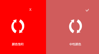 在扁平化設(shè)計(jì)中,色彩的應(yīng)用極為重要。由于拋棄了擬物化設(shè)計(jì)風(fēng)格的漸變、高光等特效,只能使用純色塊來(lái)進(jìn)行設(shè)計(jì),那么在色彩的搭配和選擇上就極有講究。為了能讓使用者舒適的閱讀、使用設(shè)計(jì)者的作品,不造成眼睛疲勞或者其它不適感,設(shè)計(jì)師應(yīng)盡量選擇中性的顏色。也就是說(shuō),要避免使用飽和度過(guò)高的純色,比如純紅、純綠、純藍(lán)等顏色,因?yàn)檫@些顏色在展示的時(shí)候會(huì)非常刺眼,嚴(yán)重影響使用者的視覺(jué)體驗(yàn)。同樣可以通過(guò)下面的圖片來(lái)對(duì)比兩者之間的差異: