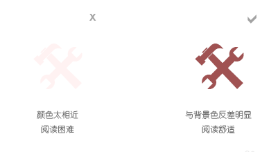 在色彩的應(yīng)用中,要注意顏色之間的對(duì)比,只有通過(guò)鮮明的顏色對(duì)比,才能迅速抓住使用者的眼球,讓設(shè)計(jì)師的意圖表現(xiàn)的更加明確。通常的技巧是,通過(guò)亮度、色溫、對(duì)比色、互補(bǔ)色等等手段來(lái)實(shí)現(xiàn)顏色的對(duì)比,應(yīng)盡量避免使用參數(shù)相近的顏色,這樣的顏色搭配會(huì)使閱讀困難,甚至?xí)斐墒褂谜叩臉O度不適。可以通過(guò)下面的這張圖來(lái)體會(huì)其中的奧妙:
