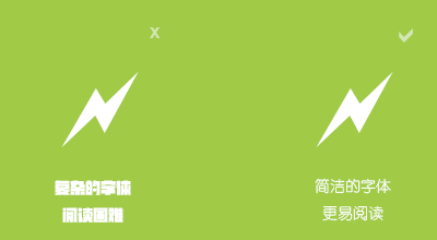 在扁平化設(shè)計(jì)風(fēng)格中,因?yàn)樽非髽O致的簡(jiǎn)潔,力求最快速、最直觀的表達(dá)設(shè)計(jì)者的意圖,所以在字體的選擇上,也是以簡(jiǎn)潔、清爽為標(biāo)準(zhǔn)。應(yīng)采用通用的、筆劃清晰的字體,避免使用字跡不清的字體,比如草書(shū),特殊字體等,也應(yīng)該避免使用已經(jīng)不再流通的字體,比如古代甲骨文、篆體字等等(特殊用途除外)。對(duì)于中文字體來(lái)說(shuō),諸如雅黑、幼圓或者細(xì)黑等字體都是不錯(cuò)的選擇。英文字體也是同樣的道理,如下圖所示: