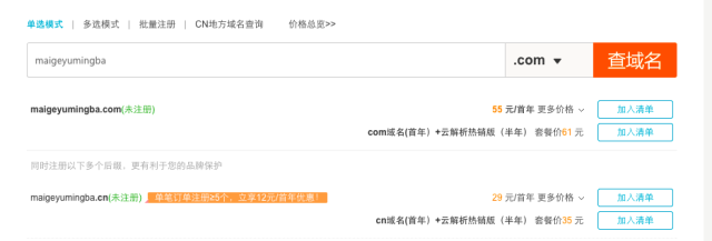 我們?cè)谧?cè)域名的時(shí)候,只能注冊(cè)“主體.后綴”的形式的域名,前面的www或其他內(nèi)容在我們注冊(cè)成功后可以自行在域名解析后臺(tái)進(jìn)行設(shè)置。下圖是購(gòu)買域名的示例圖。